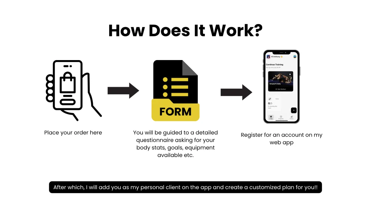 Register for an account on my web app. After which, I will add you as my personal client on the app and start creating a customized workout plan for you!